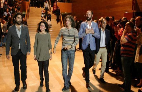 - Après la présentation du film dans le cadre de la 60e édition du festival de San Sebastian, (G. à D.) l’acteur Karim Saleh, la coscénariste Joëlle Touma, le réalisateur Ziad Doueiri et les acteurs Ali Suliman et Ramzi Maqdisi sont salués par les applaudissements du public.