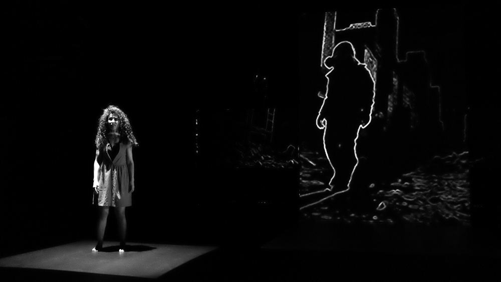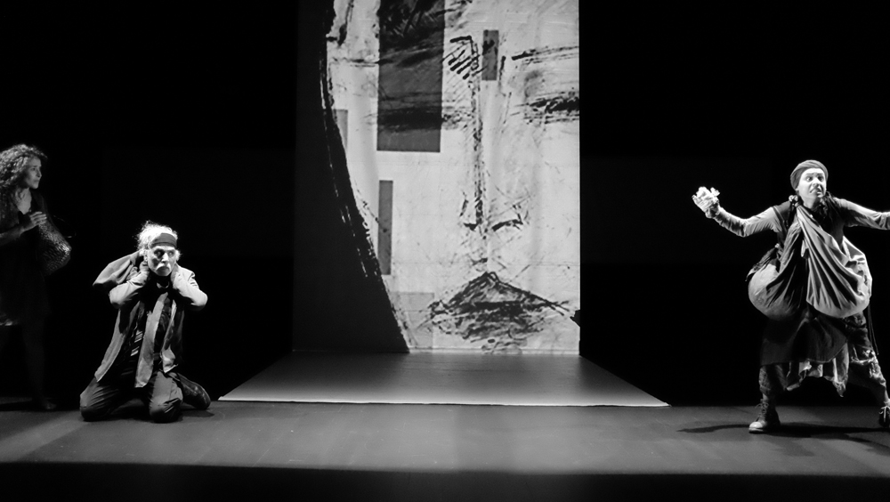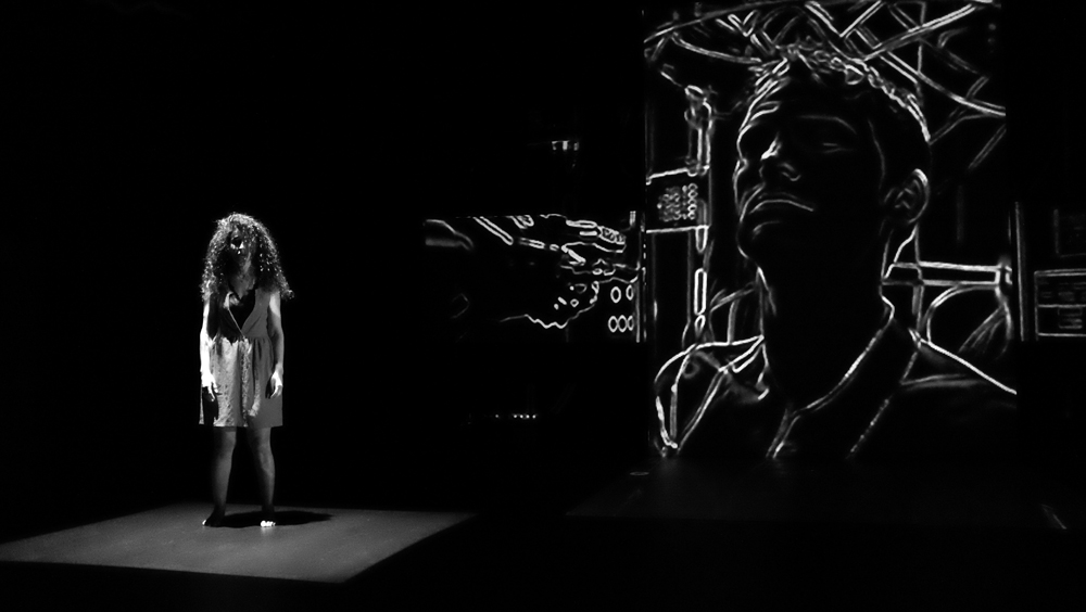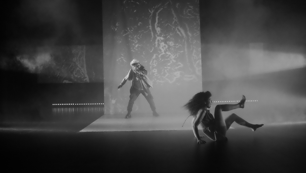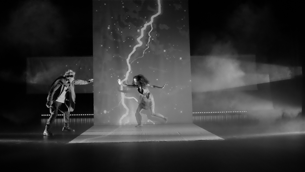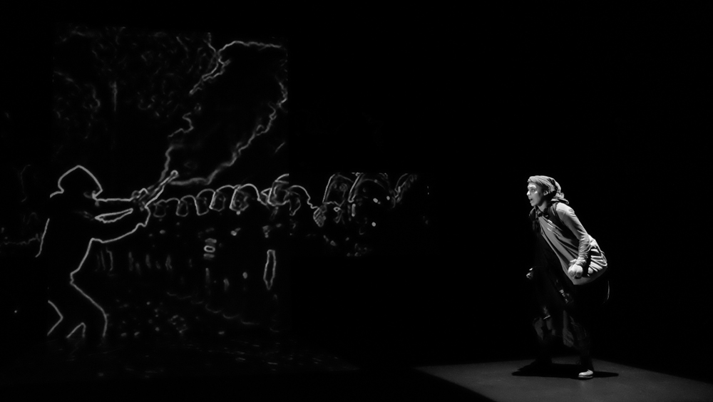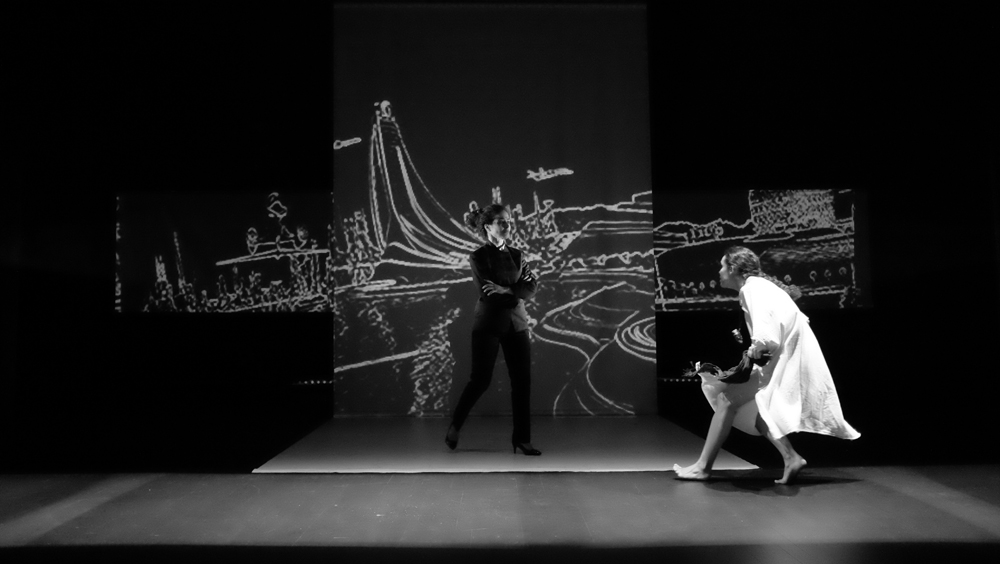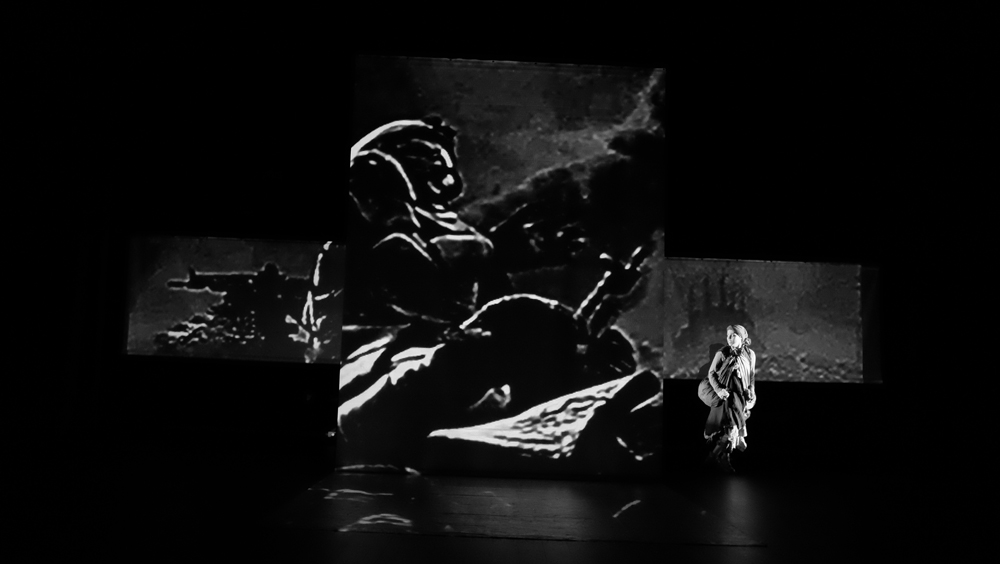 Pitch plutôt insipide. Insipide par rapport à ce qu’en a fait l’équipe technique. Un certain Sergio Gazzo tient le rôle du boss de « Scénographie et conception vidéo ». Je jure sur mon livre de chevet que je ne connais pas ce Monsieur. Pas de copinage. Son travail explose à la figure du spectateur. Un flux d’images. Artificielles, IA, bidouillées, surbidouillées, postproductionnées ? Probable. Pour une fois, j’aime l’IA. De la pure création. Un long tunnel absorbant d’atmosphères plus étranges et glauques les unes que les autres. L’impression de glisser dans une 4e, 5e, 12e dimension. Dans l’utopie de Sogra autant dans la répression et le chaos du monde extérieur. Dali et Vasareli métissés avec le plus pointu des reporters de guerre, David Lynch à l’horizon, les encres noire et blanche des meilleurs bédéistes, tout est là. Je m’emballe, je m’emballe. Le vertige ressenti sur mon siège fait déraisonner mon écriture.